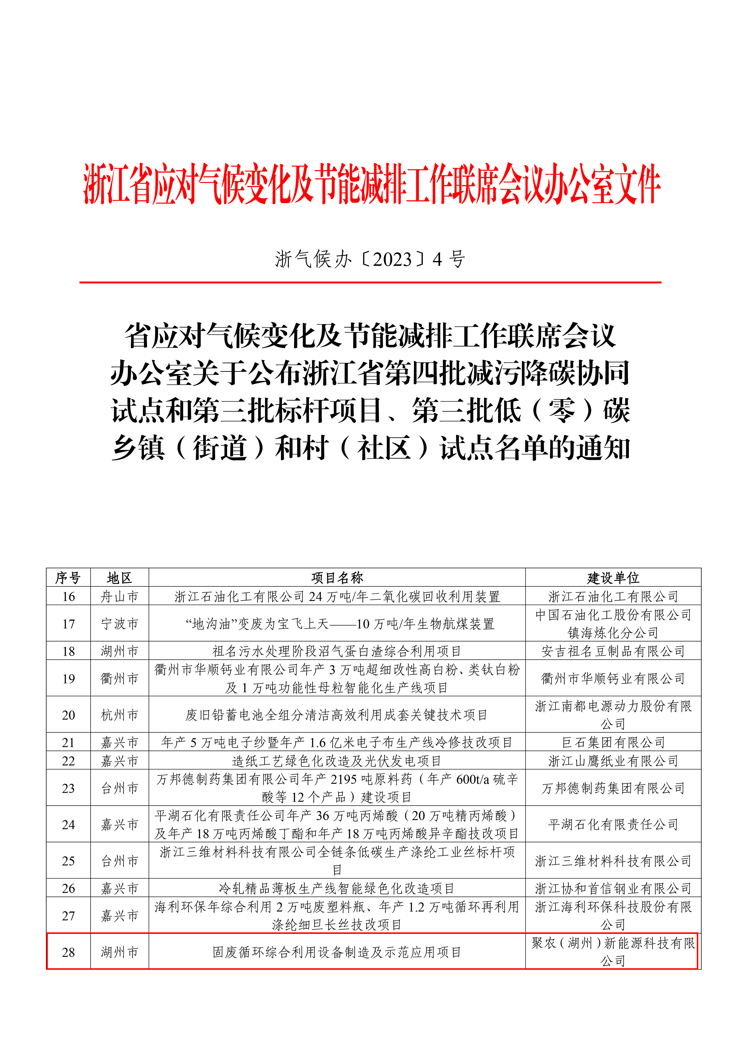 2023年10月23日,公司聚农(湖州)新能源科技有限公司,位于浙江湖州”固废循环综合利用设备制造及示范应用项目”被省应对气候变化及节能减排工作联席会议办公室列入浙江省第四批减污降碳协同试点和第三批标杆项目名单。